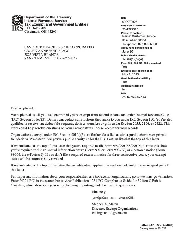 Save Our Beaches SC Incorporated is a California nonprofit corporation holding a 501(c)3 status with the IRS. All donations are fully deductible. If you need a receipt for your donation, please click the Contact Button to obtain one. Thank you very much for your support.