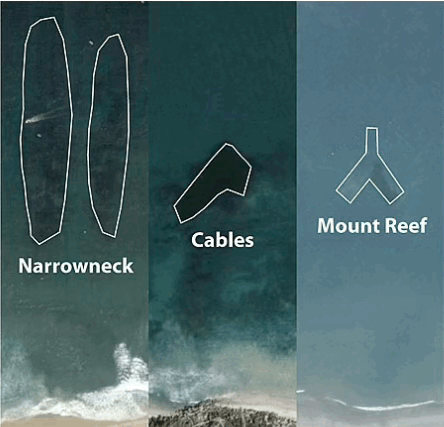 Artificial reefs, which are generally oriented offshore and parallel to the shoreline like breakwaters, but are below mean low tide (submerged). These can also be known as "submerged artificial breakwaters".